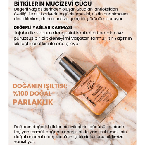 - Cilt, vücut ve saç bakımında kullanım sunan besleyici ve nemlendirici ışıltılı vücut yağıdır.