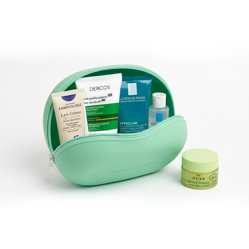 Nuxe dudak kremi 15g + Embryolisse nemlendirici 15ml + LRP tonik 14ml + Vichy Dercos kepek karşıtı şampuan 50ml + LRP temizleme jeli 15ml + Yeşil çanta