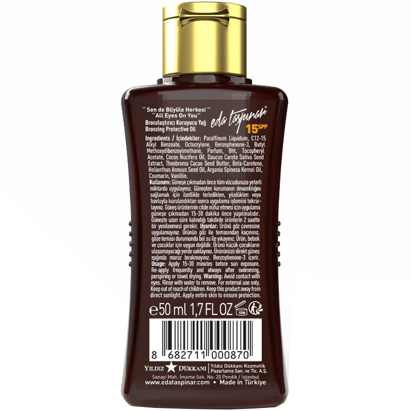 - Güneş sonrası hem elde ettiğiniz bronzluğu korumak hem de sağlıklı bronzlaşmak için Eda Taşpınar bronzluk koruyucu losyon kullanmanız tavsiye edilir.