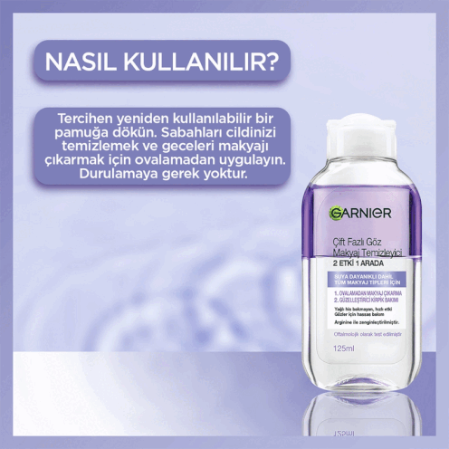 Nasıl Kullanılmalı: Kullamadan önce çalkalayınız. Bir pamuk yardımıyla göz makyajınızı temizleyiniz.