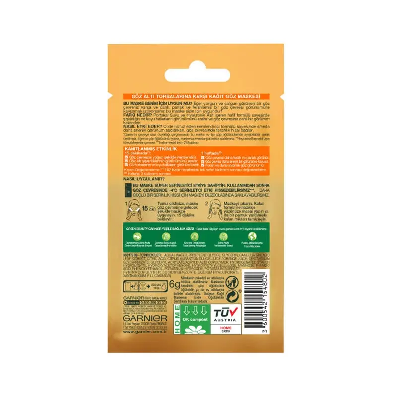 - Portakal suyu ve hyaluronik asit içeren göz çevresi kağıt maskedir.