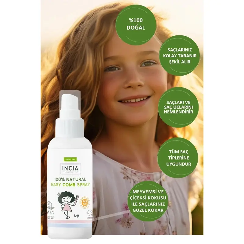 - Çocuklar için geliştirilmiş %100 doğal kolay saç tarama spreyidir.