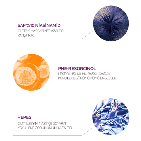 - Koyu leke karşıtı geliştirilmiş Niacinamide içeren bakım serumudur.