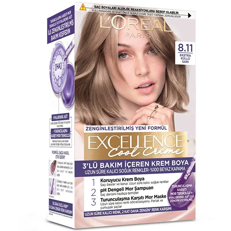 Loreal Paris Excellence Cool Creme - Krem Saç Boyası No: 8.11 Ekstra Küllü Sarı- Uzun süre kalıcı saç boyasıdır.