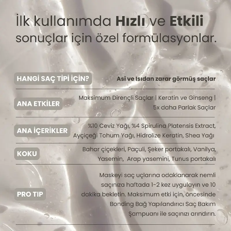 - Isıdan zarar görmüş saçlar için geliştirilmiş bakım maskesidir.