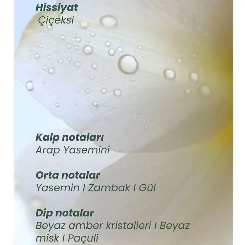 - Dip notalarında beyaz amber kristalleri, beyaz misk ve paçuli