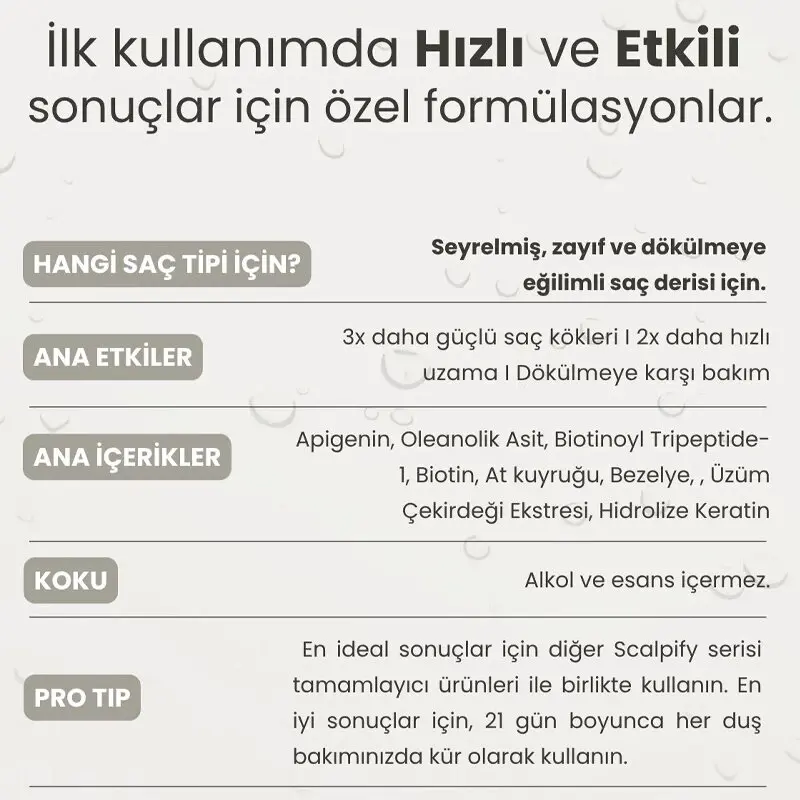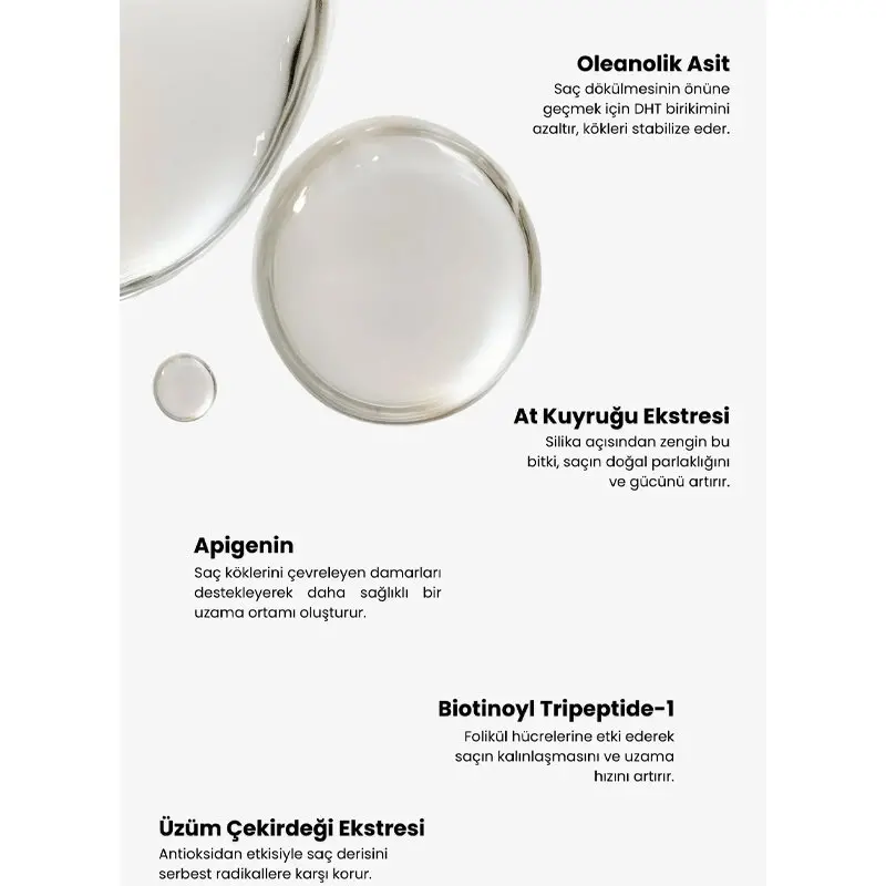 - İçeriğinde Folikül Güçlendirici Biberiye, Biotin ve Peptit bulunmaktadır.