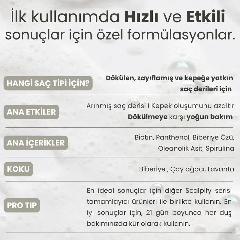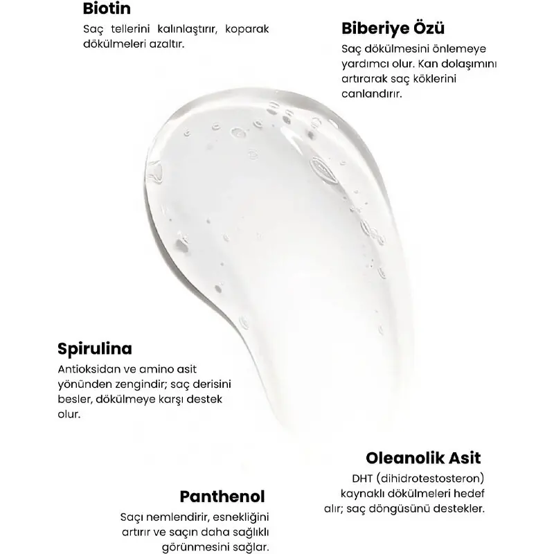 - İçeriğinde Biberiye özü Kolajen, Biotin ve Peptid bulunmaktadır.