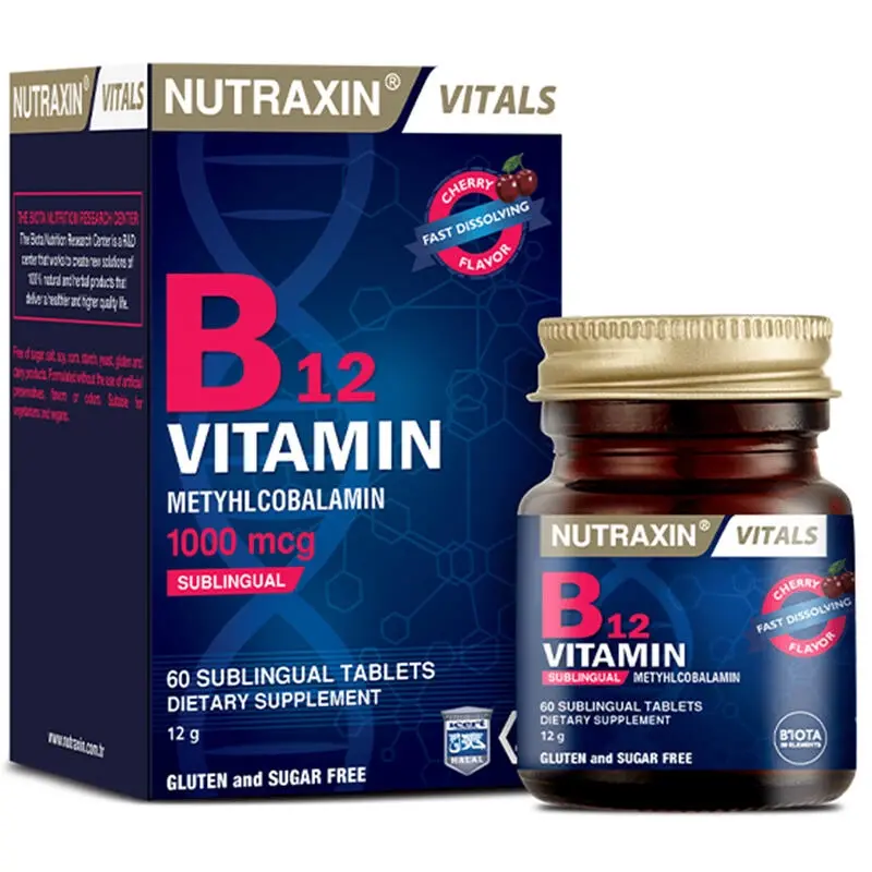- Nutraxin Vitamin B12 1000 mcg biyoyararlılığı yüksek metilkobalamini hızlı çözünen dil altı tableti formundadır.