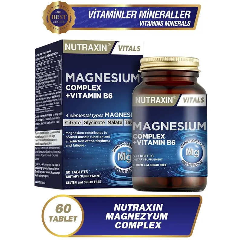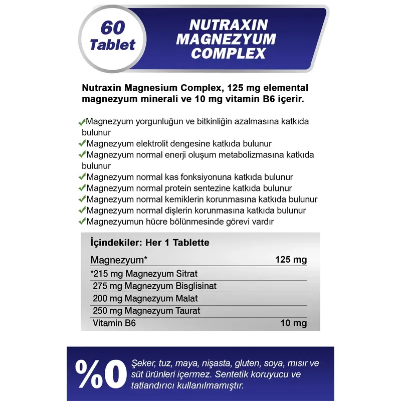 - Nutraxin Magnesium Complex, 125 mg elemental magnezyum minerali ve 10 mg vitamin B6 içerir.