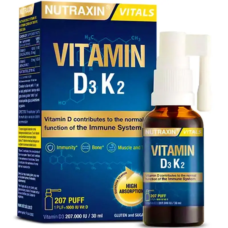 - D3 K2 vitamini her spreylemesinde 1000 IU D3 vitamini ve 25 mcg K2 vitamini içermektedir.