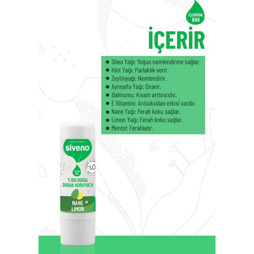 - %100 doğal bileşenlerden oluşan nane limon özlü dudak bakım kremidir.