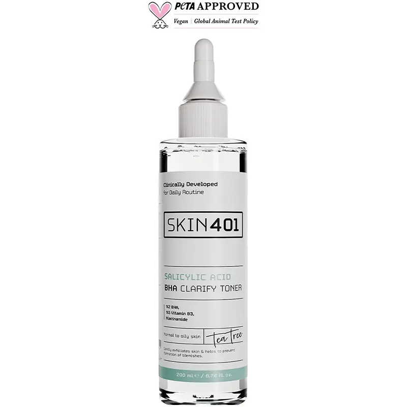 Skin401 Salicylic Acid BHA Clarify Toner - Gözenek ve Siyah Nokta Karşıtı Tonik 200ml: Aqua, Niacinamide, PPG-26-Buteth-26, Glycerin, Salicylic Acid, Aloe Barbadensis Leaf Juice, Panthenol, Melaleuca Alternifolia Leaf Extract, Arctium Lappa Root Extract, Lavandula Angustifolia Flower Extract, Achillea Millefolium Extract, Arnica Montana Flower Extract, Nasturtium Officinale Flower/Leaf Extract, Juniperus Communis Fruit Extract, Benzyl Alcohol, Sodium Benzoate , Citric Acid, Potassium Sorbate, Propylene Glycol, PEG-40 Hydrogenated Castor Oil, Benzoic Acid, Phenoxyethanol, Dehydroacetic Acid, Tetrasodium EDTA, Ethylhexylglycerin.