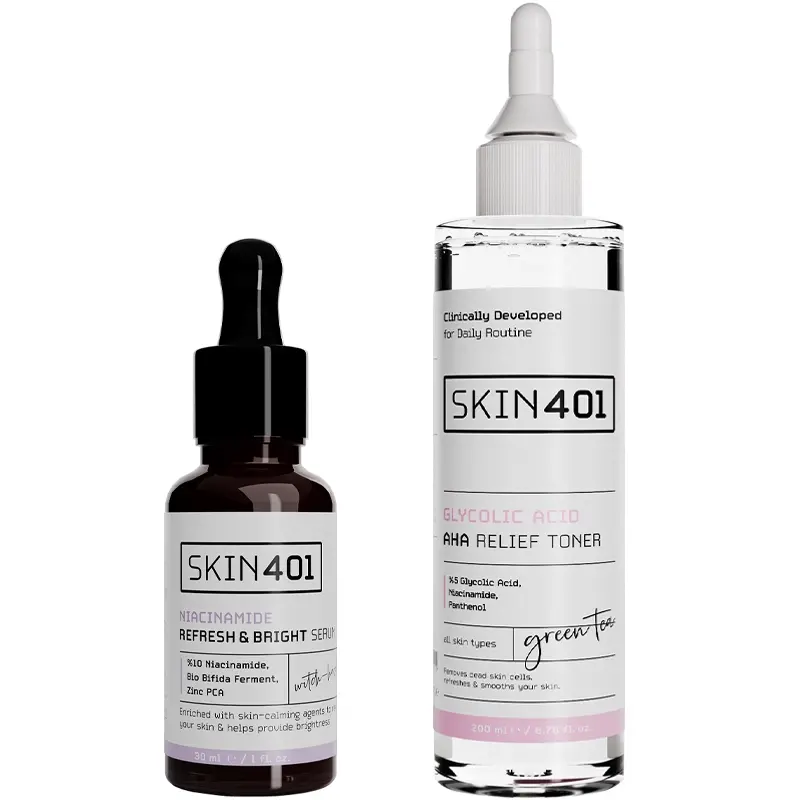 Skin401 Glycolic Acid AHA Relief Toner - Leke Karşıtı Tonik 200ml: Aqua, Glycolic Acid, Glycerin, Niacinamide, Camellia Sinensis Leaf Extract, Hamamelis Virginiana Leaf Water, Achillea Millefolium Extract, Arnica Montana Flower Extract, Lavandula Angustifolia Flower Extract, Arctium Lappa Root Extract, Nasturtium Officinale Flower/Leaf Extract, Panthenol, Juniperus Communis Fruit Extract, Sodium Hydroxide, Benzyl Alcohol, Sodium Benzoate, Tetrasodium Glutamate Diacetate, Benzoic Acid, Potassium Sorbate, Dehydroacetic Acid, Ethylhexylglycerin, Phenoxyethanol, Tetrasodium EDTA.