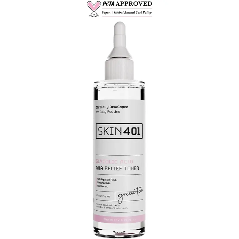 Skin401 Glycolic Acid AHA Relief Toner - Leke Karşıtı Tonik 200ml: Aqua, Glycolic Acid, Glycerin, Niacinamide, Camellia Sinensis Leaf Extract, Hamamelis Virginiana Leaf Water, Achillea Millefolium Extract, Arnica Montana Flower Extract, Lavandula Angustifolia Flower Extract, Arctium Lappa Root Extract, Nasturtium Officinale Flower/Leaf Extract, Panthenol, Juniperus Communis Fruit Extract, Sodium Hydroxide, Benzyl Alcohol, Sodium Benzoate, Tetrasodium Glutamate Diacetate, Benzoic Acid, Potassium Sorbate, Dehydroacetic Acid, Ethylhexylglycerin, Phenoxyethanol, Tetrasodium EDTA.