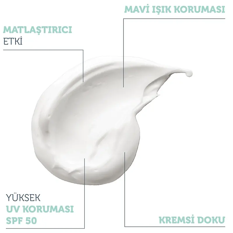 - SPF 50+ cildi güneşe ve çevresel faktörlere karşı korumaya yardımcı olur.
