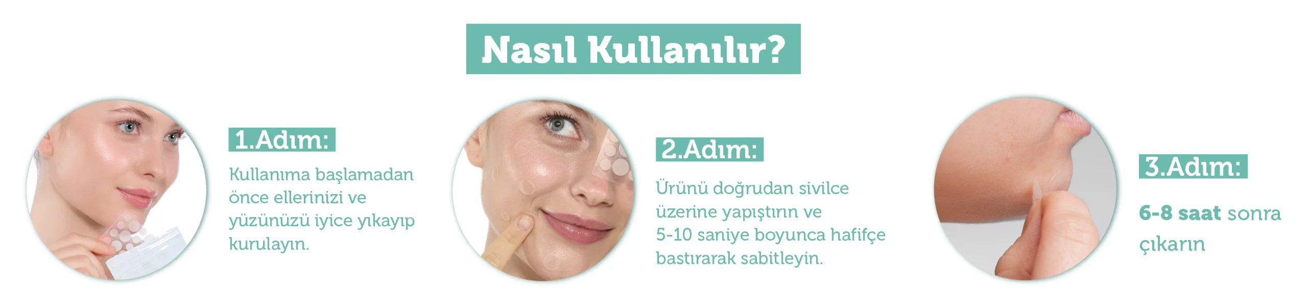 Nasıl Kullanılmalı: Temiz ve kuru cilde uygulanmalıdır. Bandı sivilcenin üzerine yapıştırın, 4–8 saat bekletin veya rengi beyazlaşınca çıkarın.