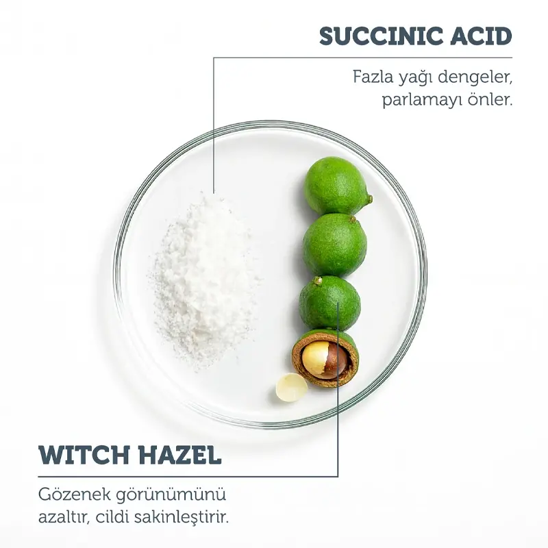- Süksinik Asit, fazla yağı dengeler ve parlamayı azaltır.
