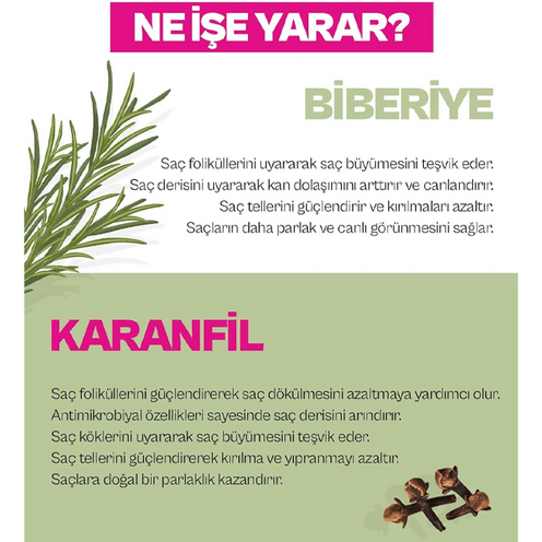 - İçeriğindeki organik biberiye özleri ve doğal karanfil özleri saçları besler ve güçlendirir.