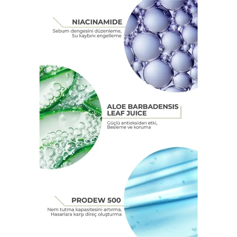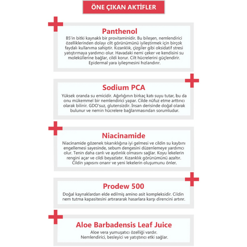 - İçeriğinde Amino Acid Complex, Sodium PCA, Centella Asiatica, Hamamelis, Aloe Vera bulunmaktadır.