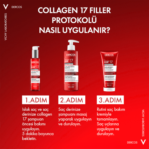- Vichy Dercos Collagen Filler 17 Ultra Repairing Shampoo, yıpranmış, incelmiş ve hacim kaybı yaşayan saçlar için geliştirilmiş onarıcı şampuandır.