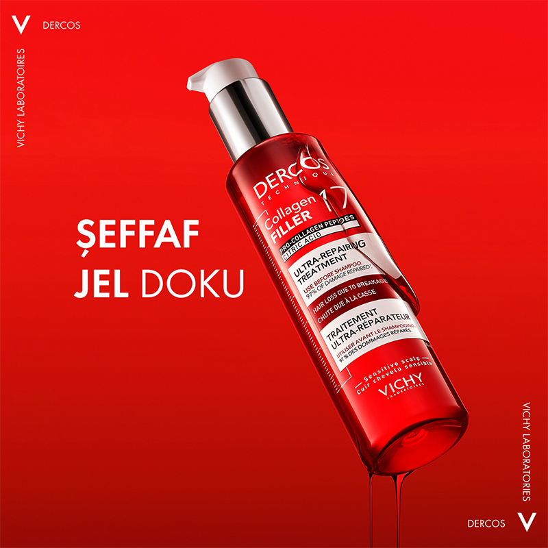 - Vichy Dercos Collagen Filler 17 Ultra Repairing Treatment, yıpranmış, incelmiş ve hacim kaybı yaşayan saçlar için geliştirilmiş şampuan öncesi onarıcı bakım ürünüdür.
