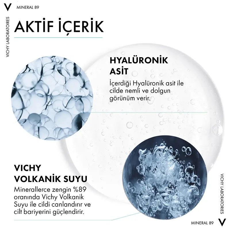 - %89 Vichy Termal Suyu ve doğal hyalüronik asit içeren bakım serumudur.